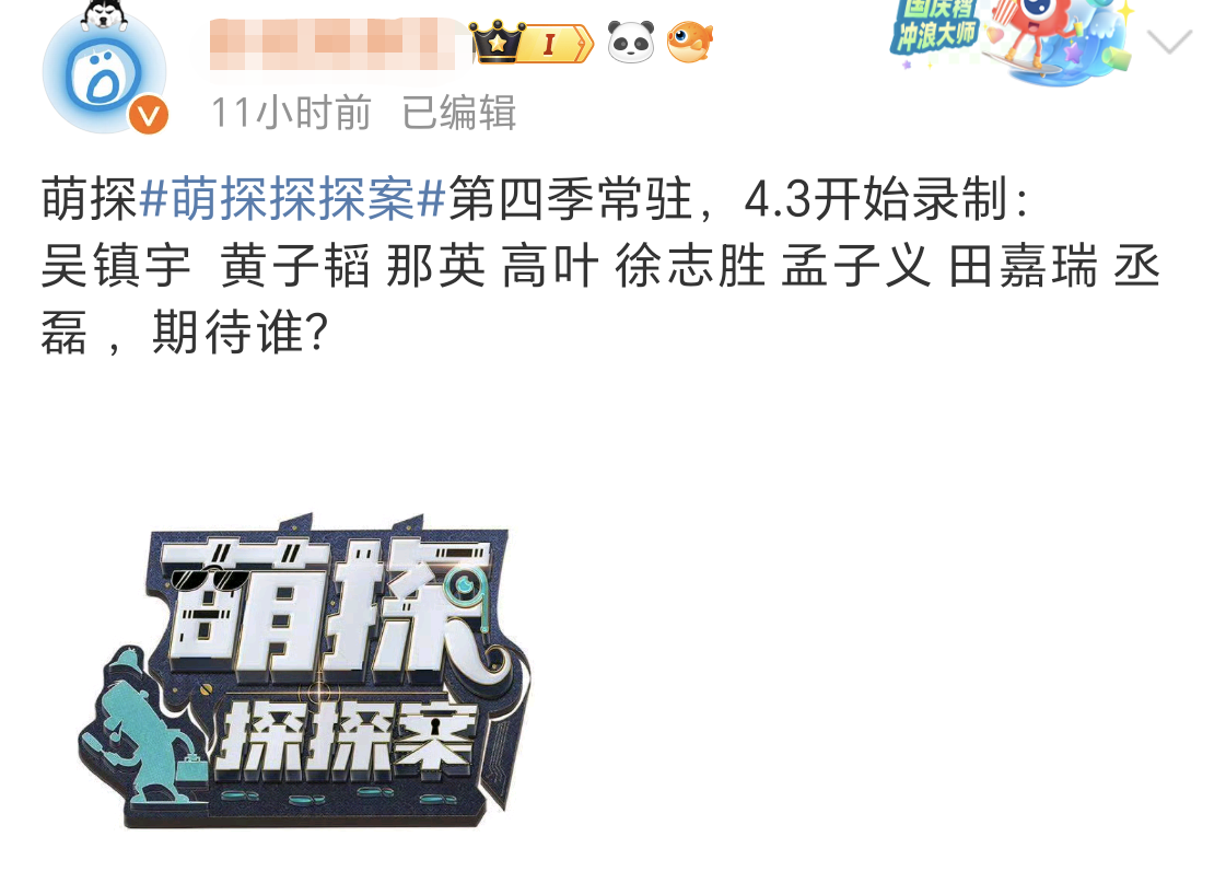 如今,《萌探探探案》也行将迎来第四季的录制,当今,据知名文娱博主爆料,新一季的录制时期仍是详情,将于4月3日进行,参与的嘉宾有:吴镇宇、黄子韬、那英、高叶、徐志胜、孟子义、田嘉瑞、丞磊,音书一出,霎时激勉弥远网友的护理,当作上一季的孙红雷领衔宁静、谢娜、孙千,娜扎退出,威望可谓是大洗牌。