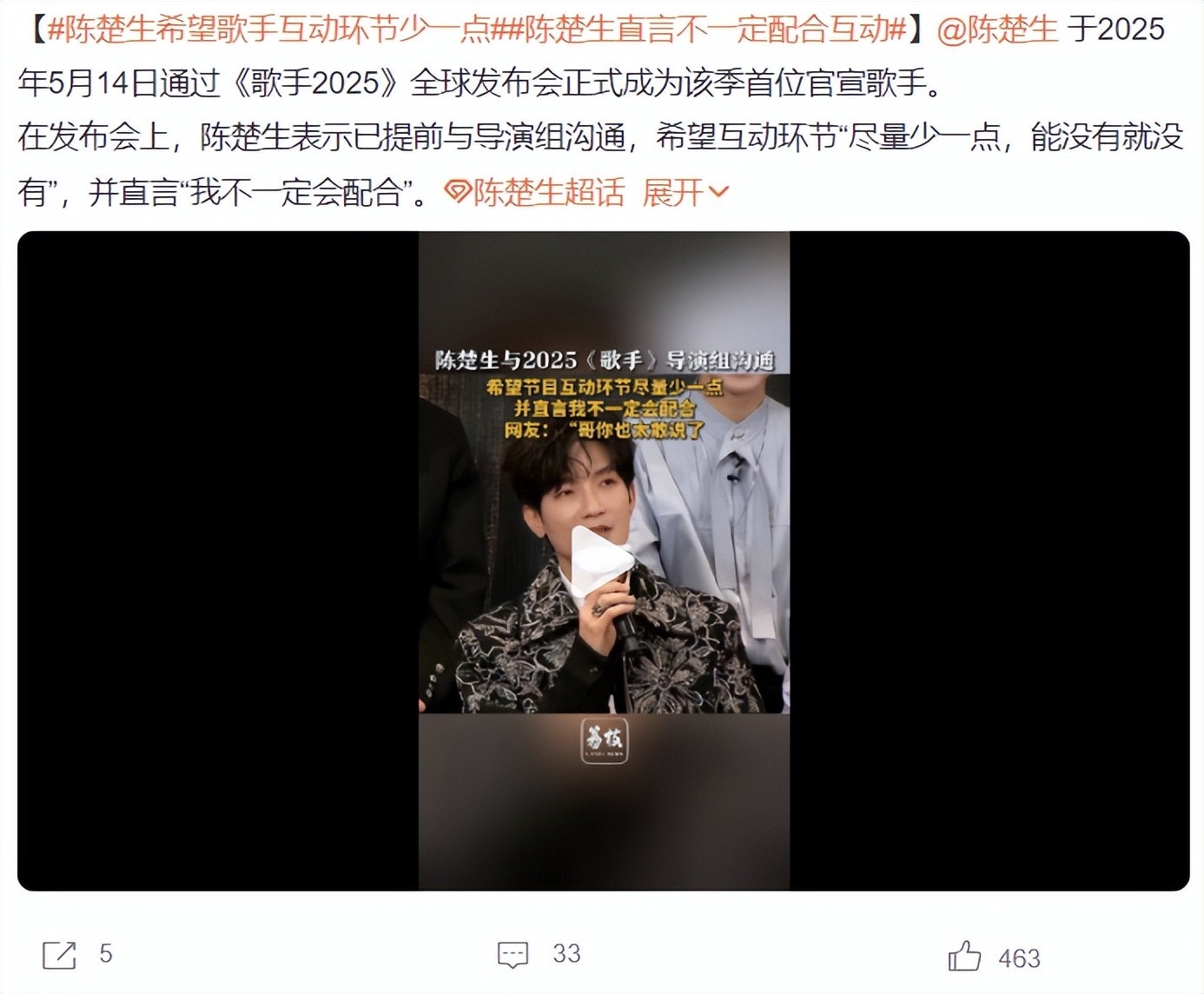《歌手2025》运转录制后,网友们戏称陈楚生为“活爹”,因为节目刚播出,陈楚生就暗示:我不一定会互助,了解陈楚生的东说念主王人知说念这句话的含金量,既然生哥说了,那么他确定不会互助。