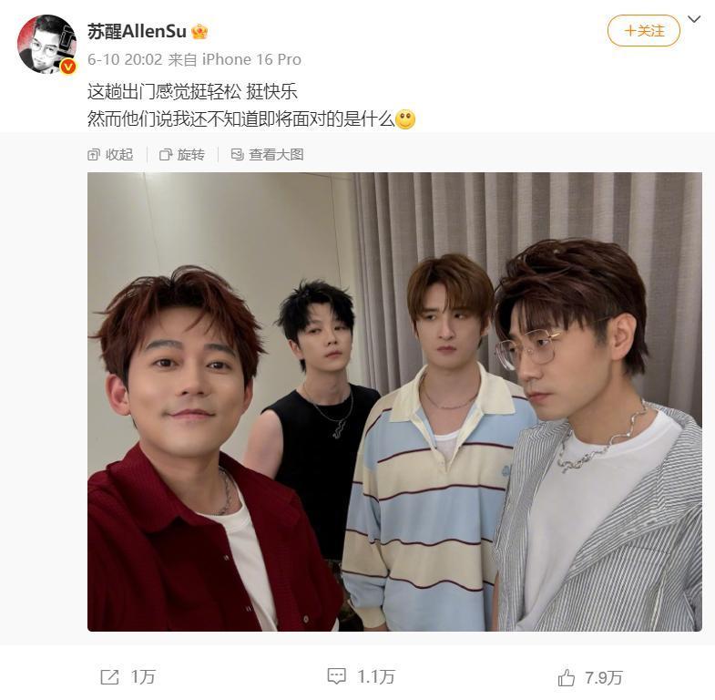 随后,苏醒在我方的酬酢账号发出音信:这趟外出嗅觉挺浮松,然后他们说我不知说念行将濒临什么,配的像片是王栎鑫、张远、王铮亮看着快活笑的苏醒。